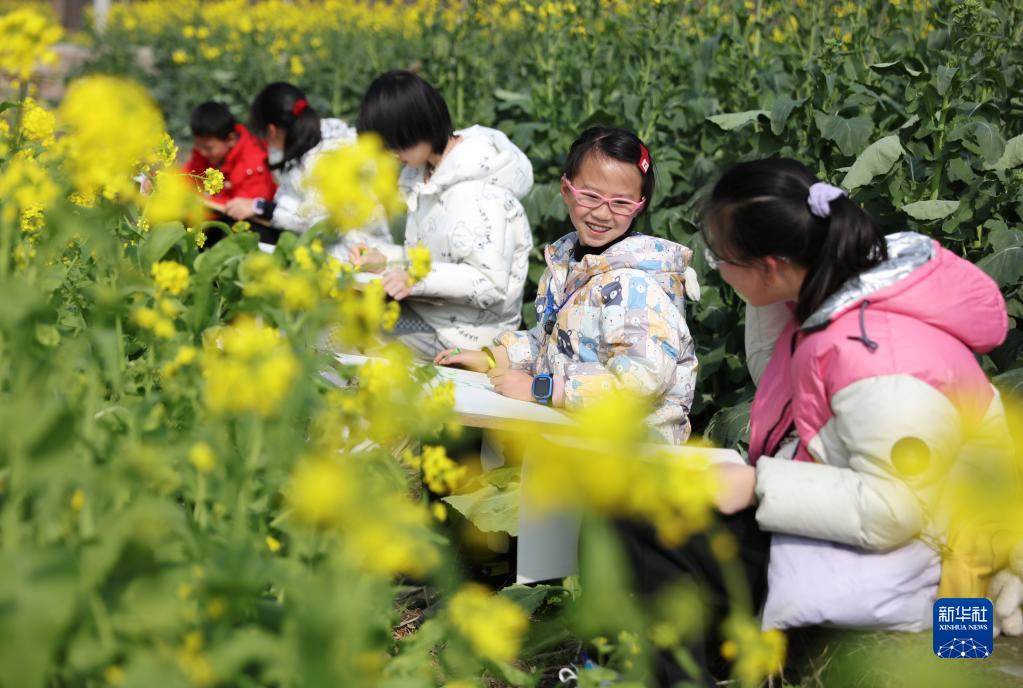 2月25日,在貴州省黔東南苗族侗族自治州施秉縣雙井鎮平寨村,小朋友在戶外寫生。
