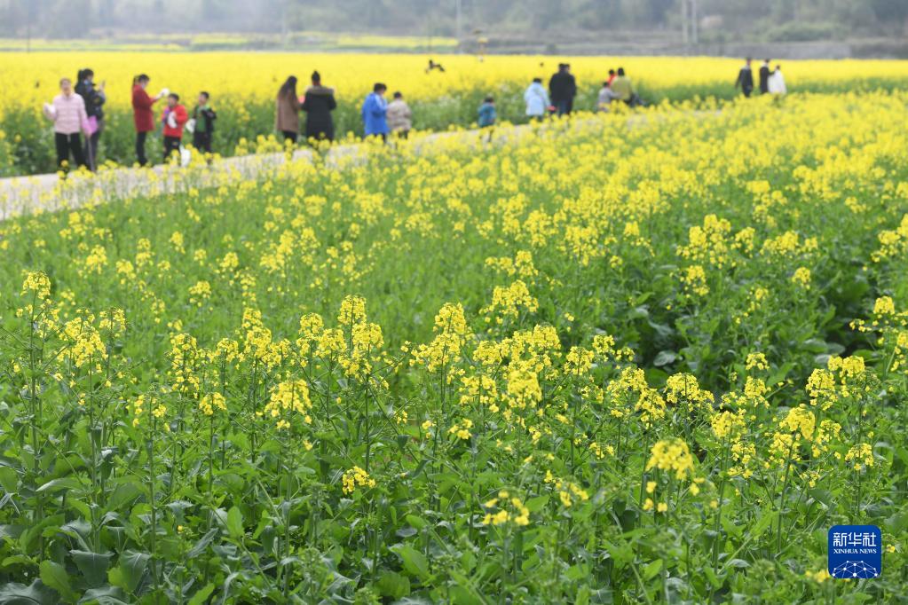 2月25日,在湖南省永州市道縣祥霖鋪鎮兩河口村,市民在油菜花間游玩。