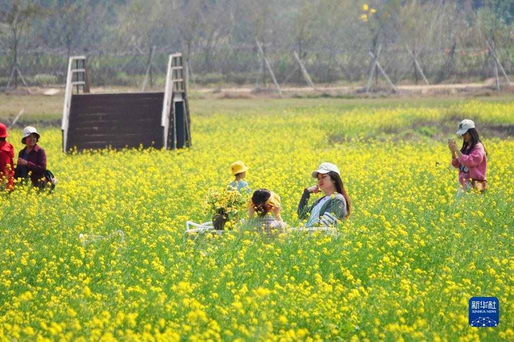 2月25日,游人在廣西南寧市江南區三江坡古村油菜花田賞花游玩。