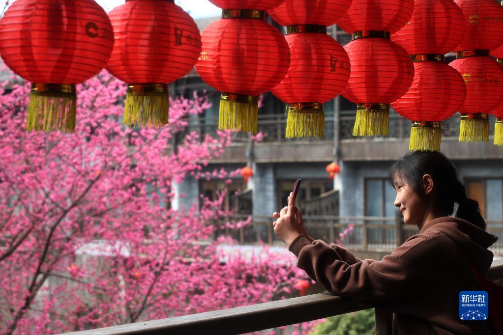 2月25日,游客在重慶市黔江區濯水古鎮觀賞梅花。