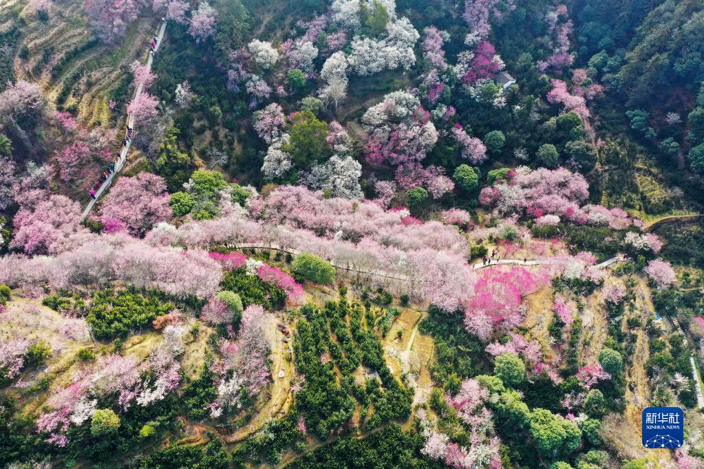 2月25日,游人在安徽省黃山市歙縣雄村鎮賣花漁村賞花(無人機照片)。