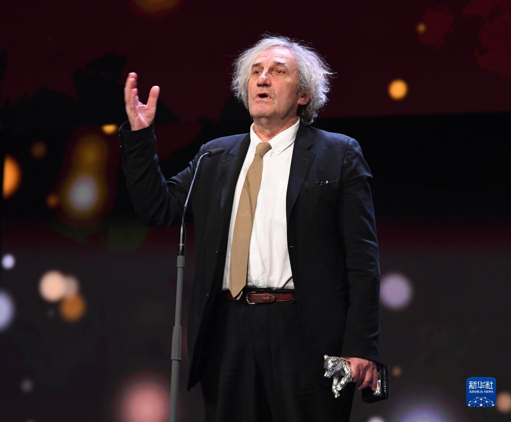 2月25日,在德國柏林,法國導演菲利普·加雷爾在頒獎儀式上發言。菲利普·加雷爾憑借影片《北斗七星》獲最佳導演銀熊獎。