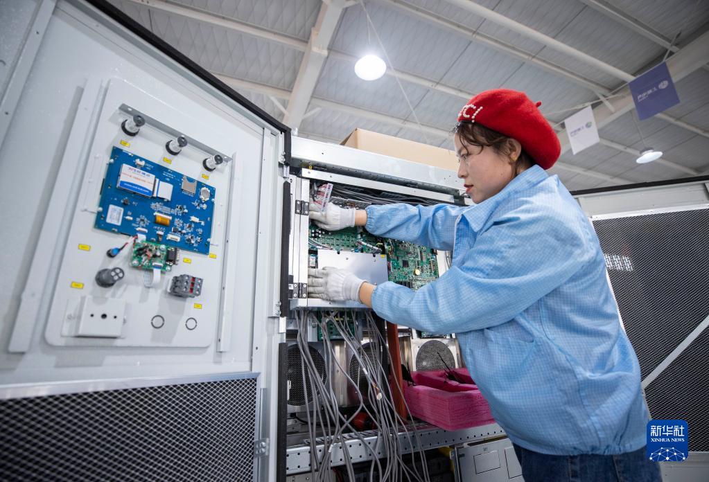 在位于寧夏同心工業園區清潔能源產業園的上能電氣(寧夏)有限公司車間內,工人為逆變器布置電纜走線(2月23日攝)。