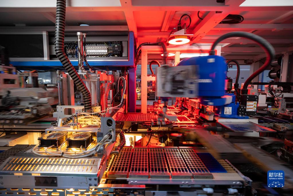 在位于寧夏同心工業園區清潔能源產業園的英利新能源(寧夏)有限公司智能制造車間內,自動化設備在加工光伏組件(2月23日攝)。