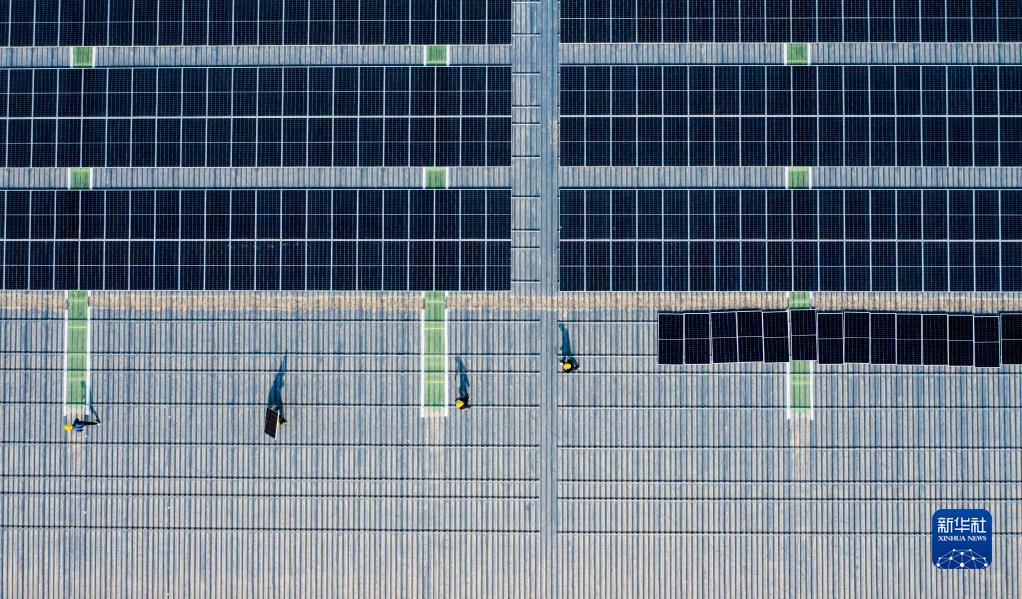 在位于寧夏同心工業園區清潔能源產業園的英利新能源(寧夏)有限公司生產車間屋頂,工作人員在安裝光伏發電板(2月23日攝,無人機照片)。