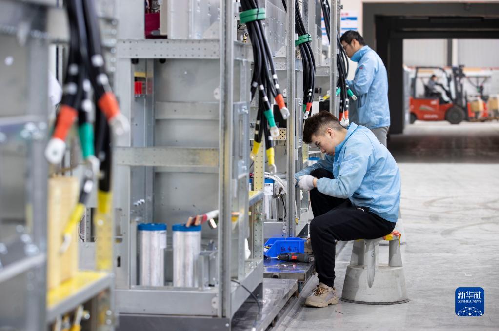 在位于寧夏同心工業園區清潔能源產業園的上能電氣(寧夏)有限公司車間內,工人為逆變器安裝開關(2月23日攝)。