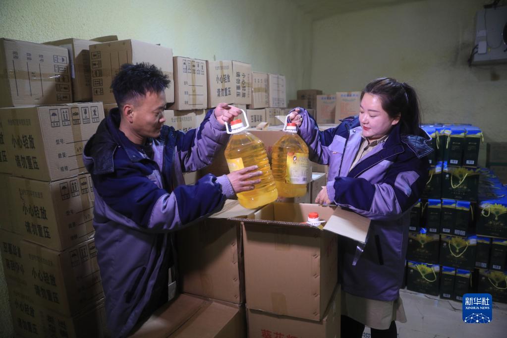 2月20日,在遼寧省朝陽市朝陽縣木頭城子鎮十家子村,王穎(右)在村里的電子商務公司倉庫準備給客戶發貨。