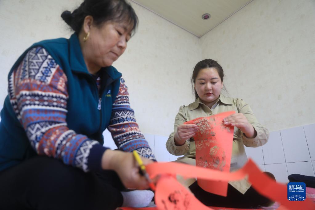2月20日,在遼寧省朝陽市朝陽縣木頭城子鎮十家子村,王穎(右)在一戶村民家中和村民一起剪紙。