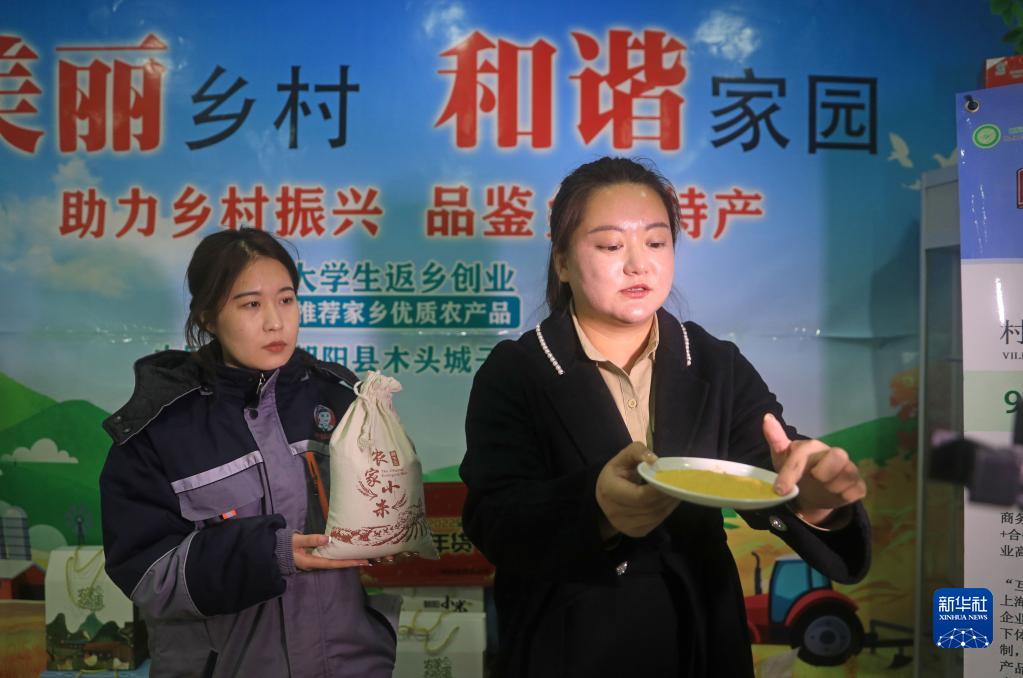 2月20日,在遼寧省朝陽市朝陽縣木頭城子鎮十家子村,王穎(右)和在村里電子商務公司工作的大學生一起直播賣貨。
