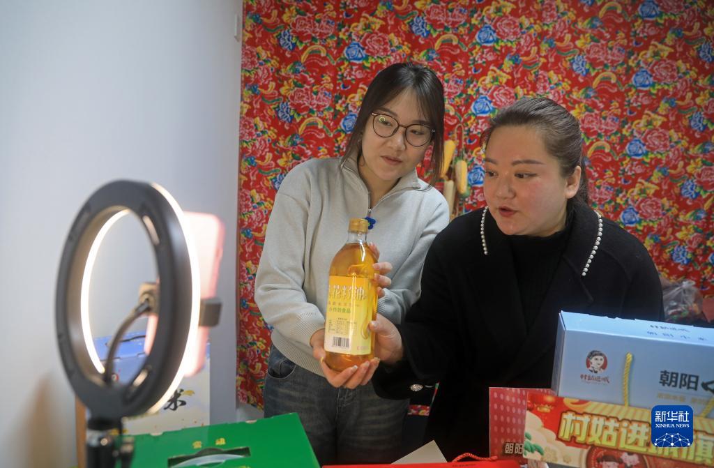 2月21日,在遼寧省朝陽市“村姑進城”實體店,王穎(右)和大學生一起直播賣貨。