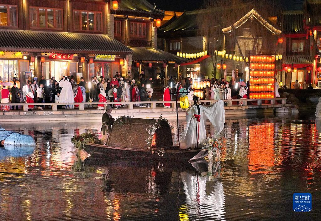 演員在洛陽市洛邑古城內為游客表演(2月22日攝)。