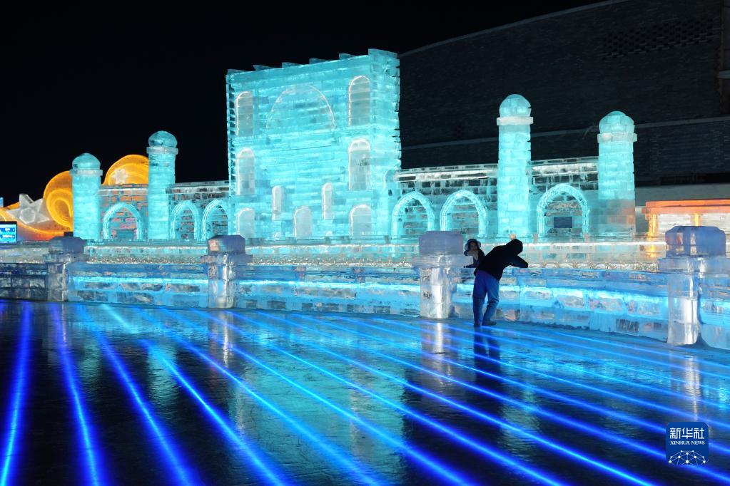 2月25日,游客在哈爾濱冰雪大世界園區拍照。