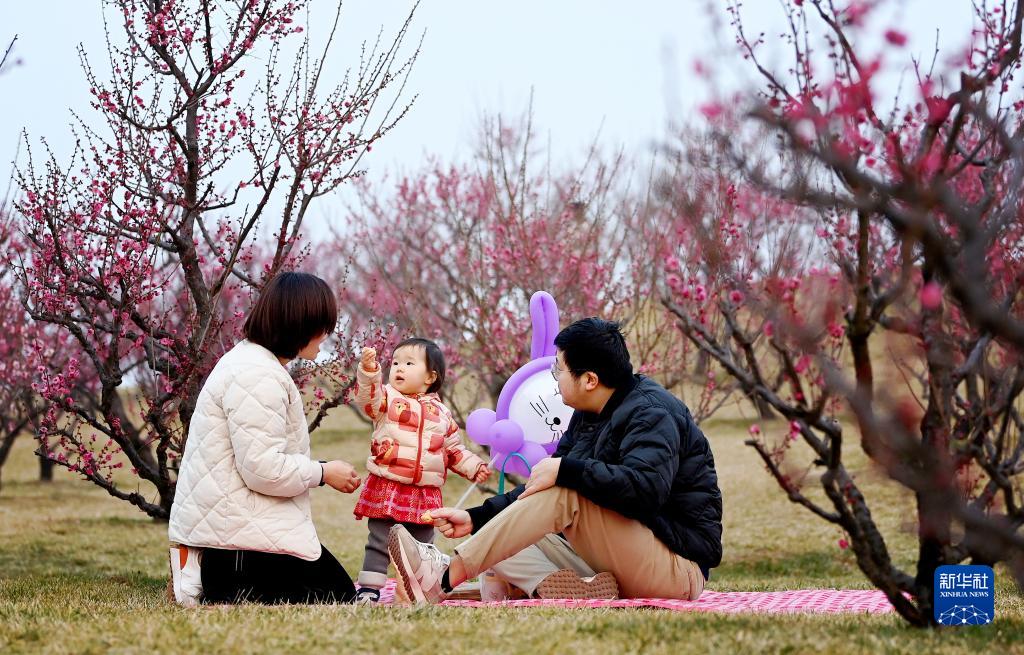 2月25日,游人在長安唐村梅園內賞梅休閑。