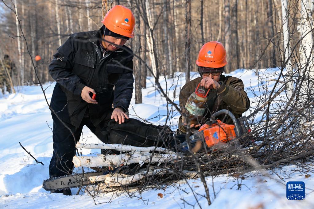 2月23日,烏龍岱林場402工隊的職工給油鋸加油準備作業。