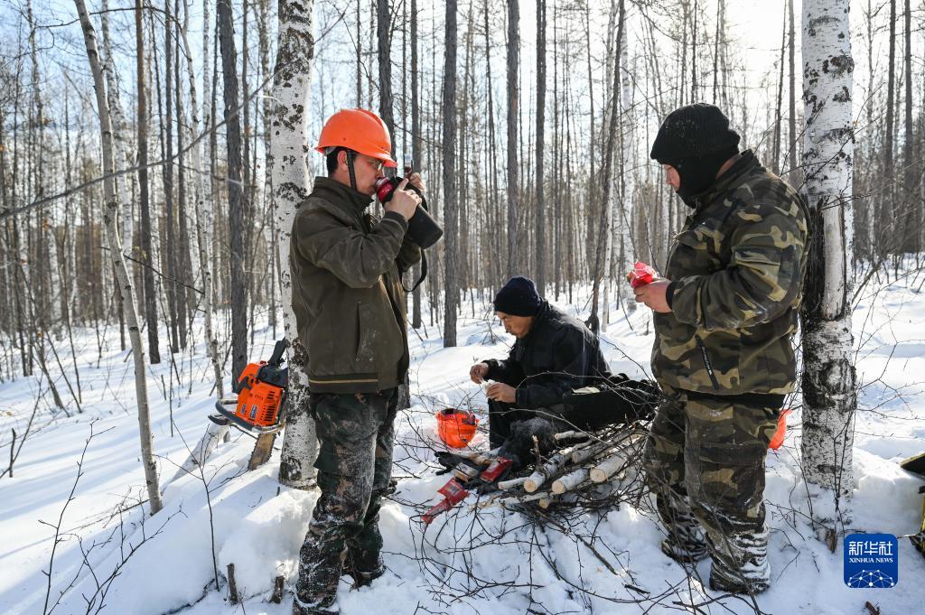 2月23日,烏龍岱林場職工在山林中趁作業間隙簡單吃點小食當午餐。