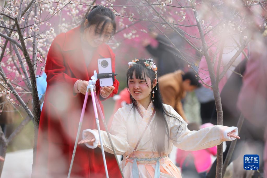 2月26日,人們在湖南省邵陽市隆回縣七江鎮守拙園直播賞花。