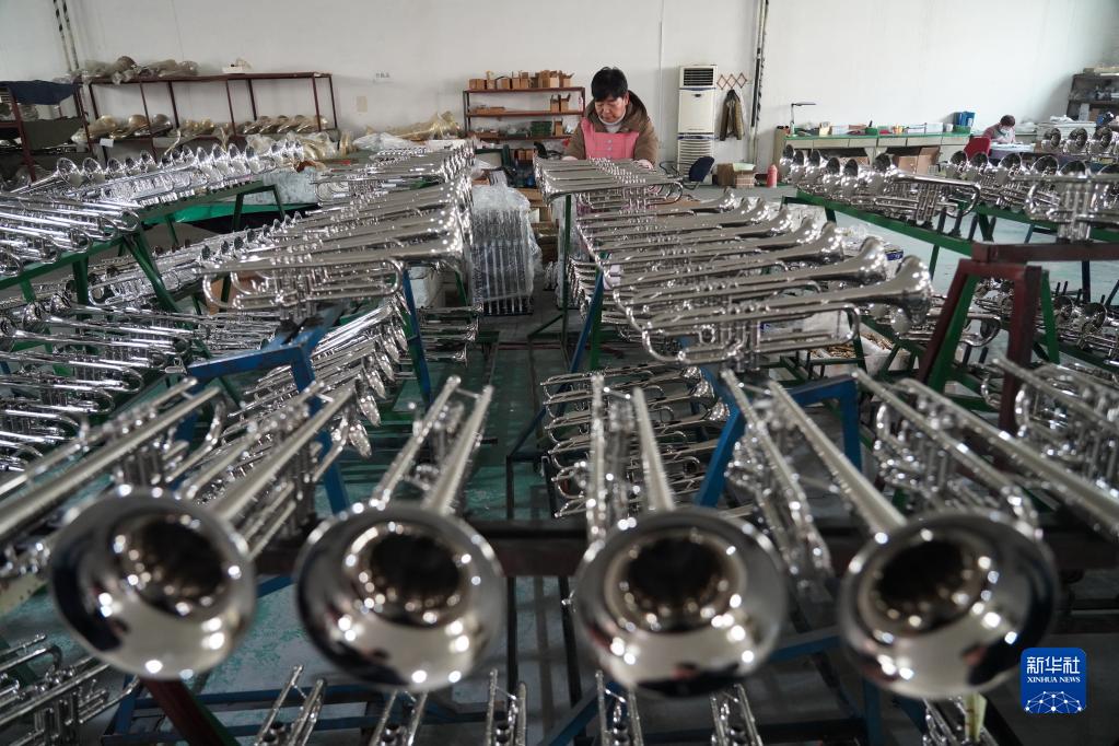 河北省武強縣一家西洋樂器生產企業的員工在整理產品(2月23日攝)。