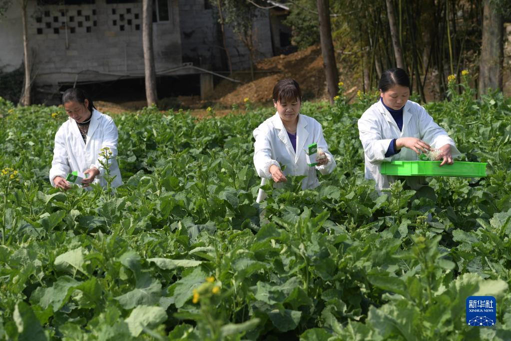 2月26日,貴州省鳳岡縣天敵昆蟲繁育中心的工作人員向油菜基地投放天敵昆蟲。