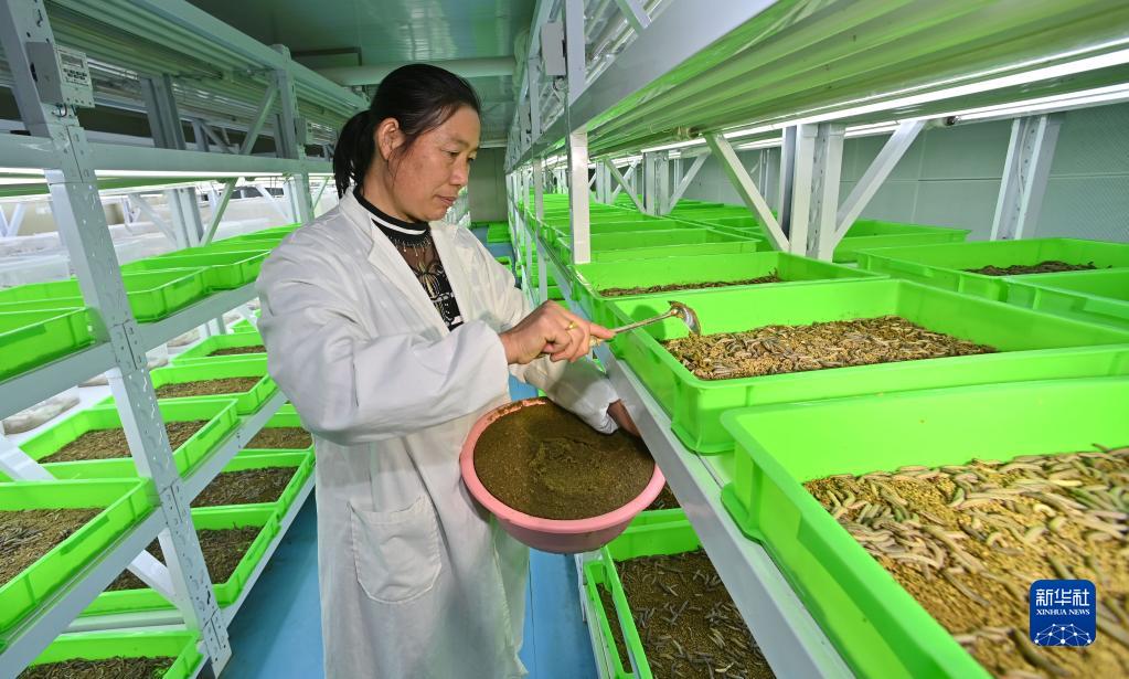 2月26日,貴州省鳳岡縣天敵昆蟲繁育中心工作人員給躅蝽的食物粘蟲投喂專用飼料。