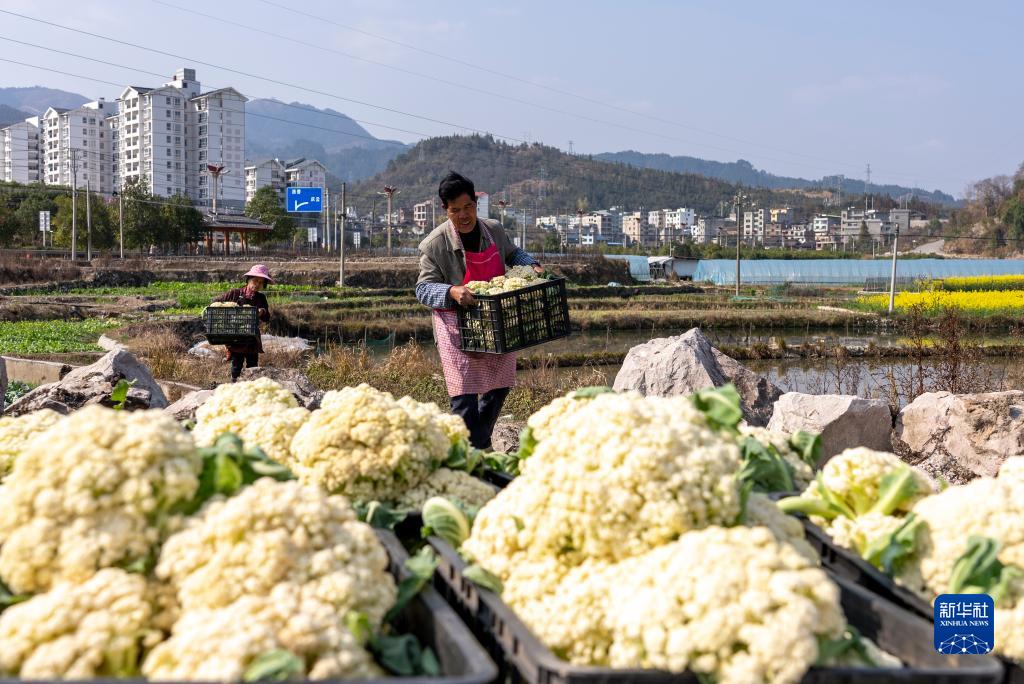 2月26日,在貴州省從江縣貫洞鎮貫洞村松花菜種植基地,菜農在田間搬運松花菜。