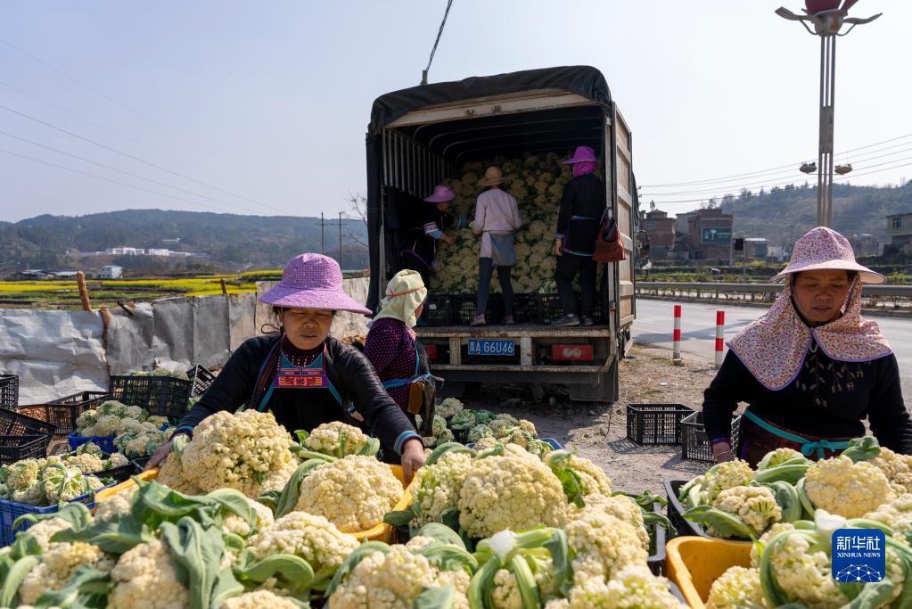 2月26日,在貴州省從江縣貫洞鎮貫洞村松花菜種植基地,菜農將剛采摘的松花菜裝車。