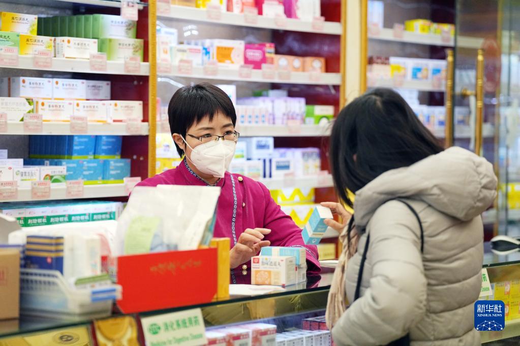 在白塔寺藥店內,張海鷗(左)為一位咨詢購藥的顧客講解幾種藥物的使用注意事項(2月22日攝)。