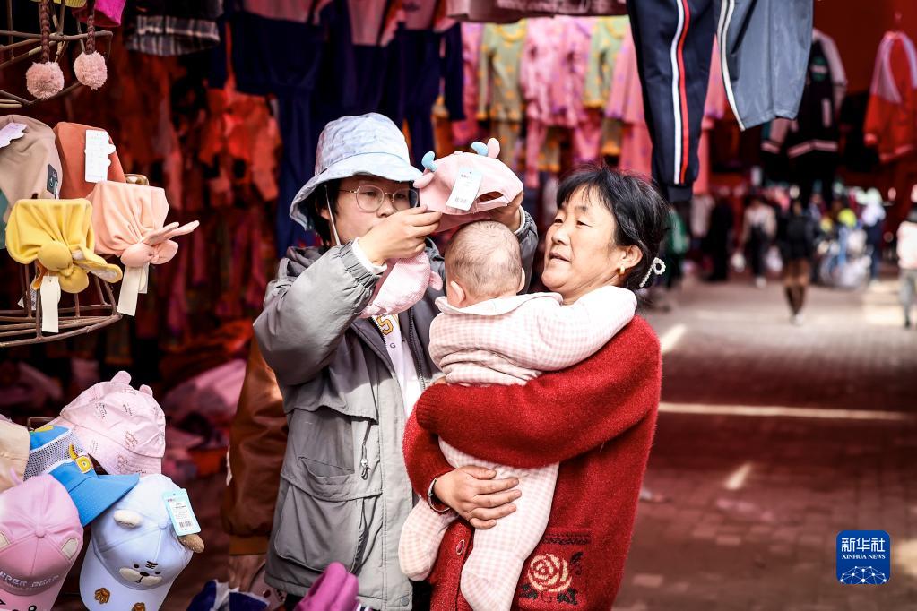 2月26日,在托克扎克鎮農貿市場,一名女士在給孩子挑選帽子。