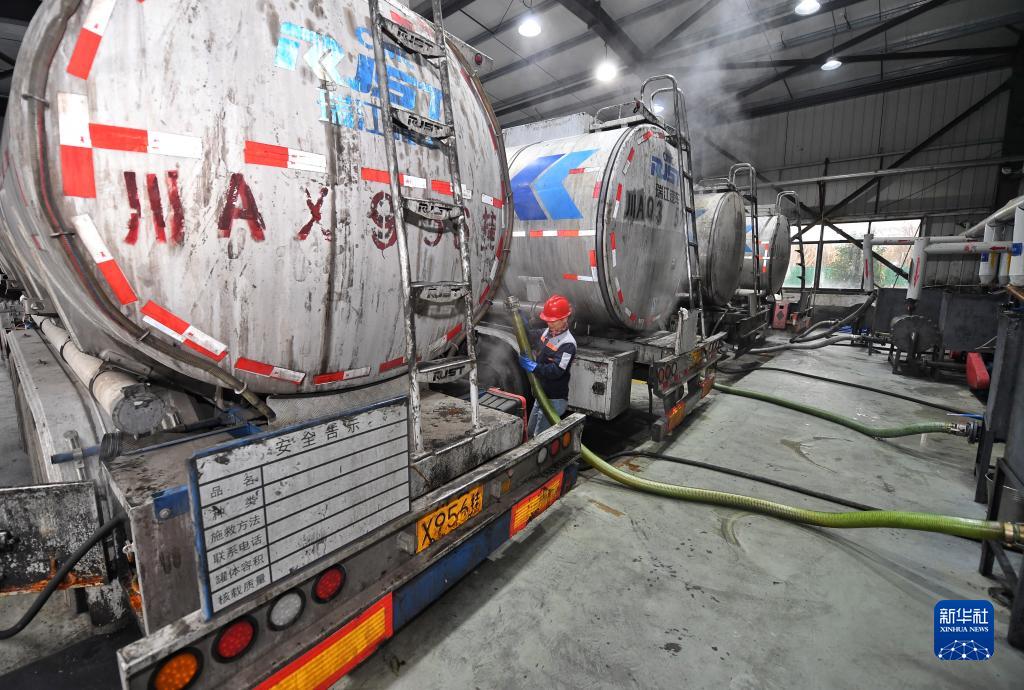 2月21日,四川一家環??萍加邢薰締T工將油罐車運來的餐廚廢油轉送至生產線。
