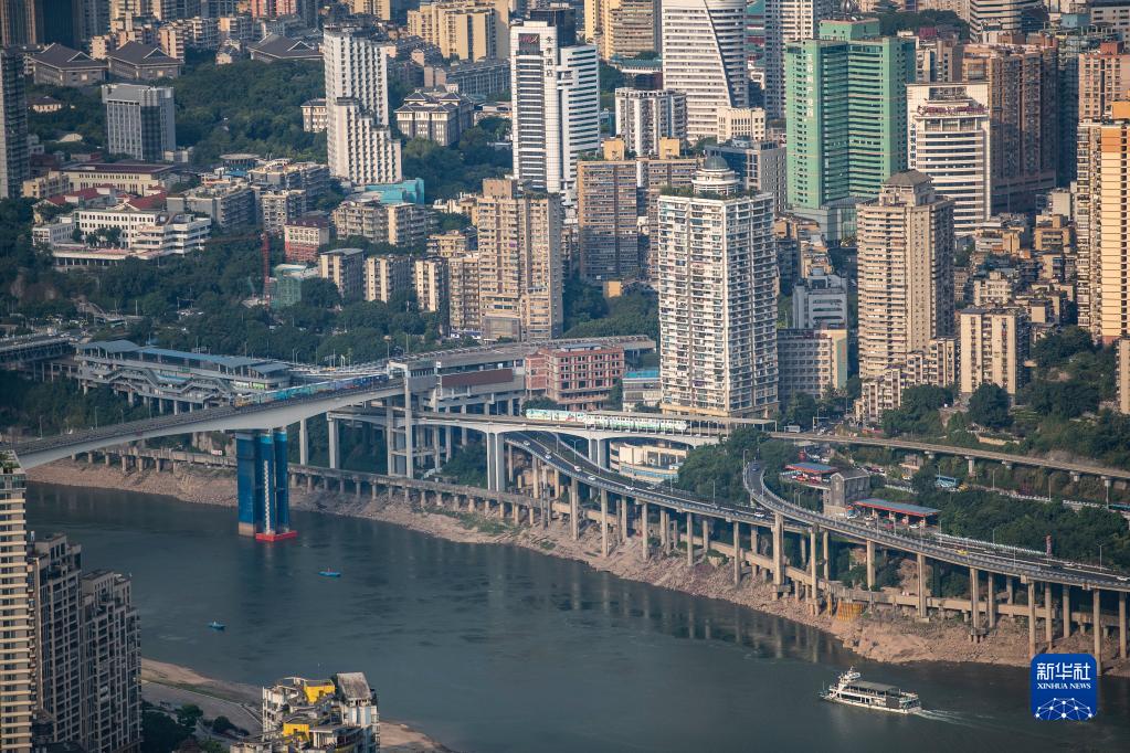 這是2022年7月13日拍攝的運營中的重慶軌道交通2號線列車(右下)和3號線列車(左上)。