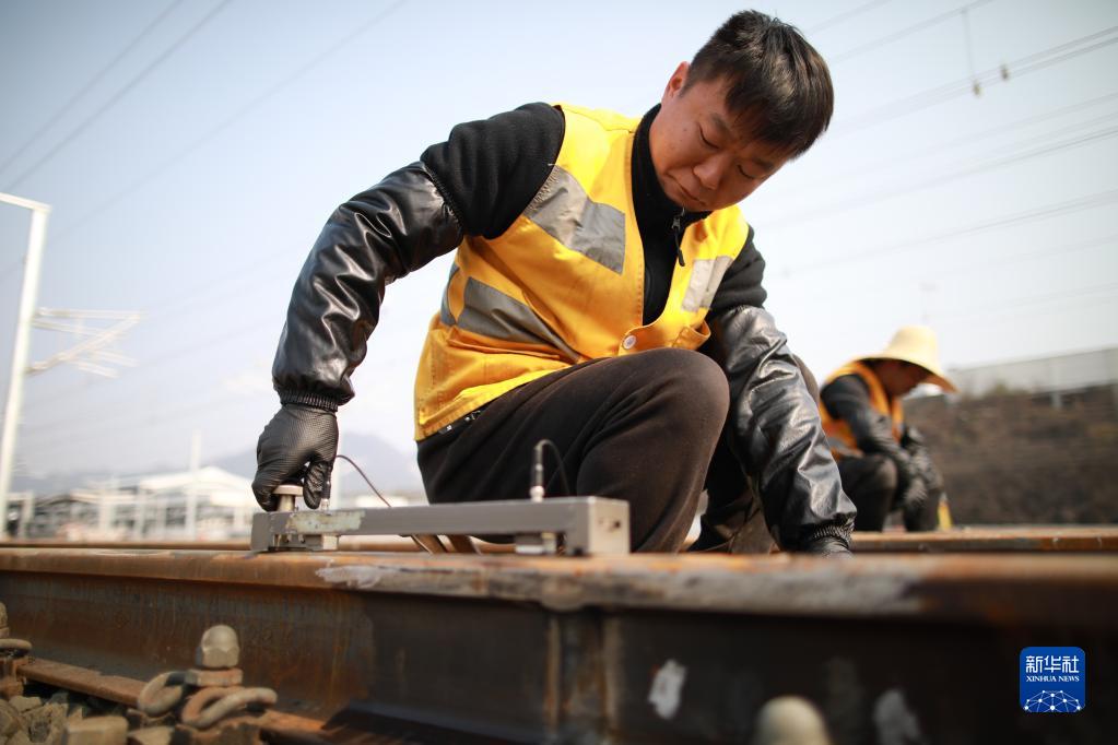 2月27日,在貴南高鐵都勻東站附近,貴陽高鐵工務段的技術人員使用鋼軌探傷儀進行探傷。