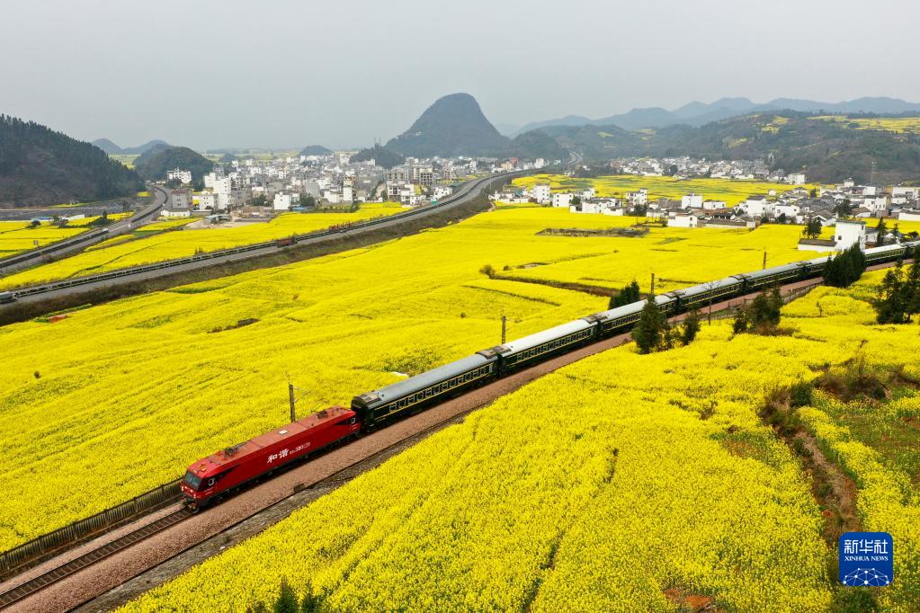 2月27日,旅游專列行進在云南曲靖市羅平縣的油菜花海中(無人機照片)。