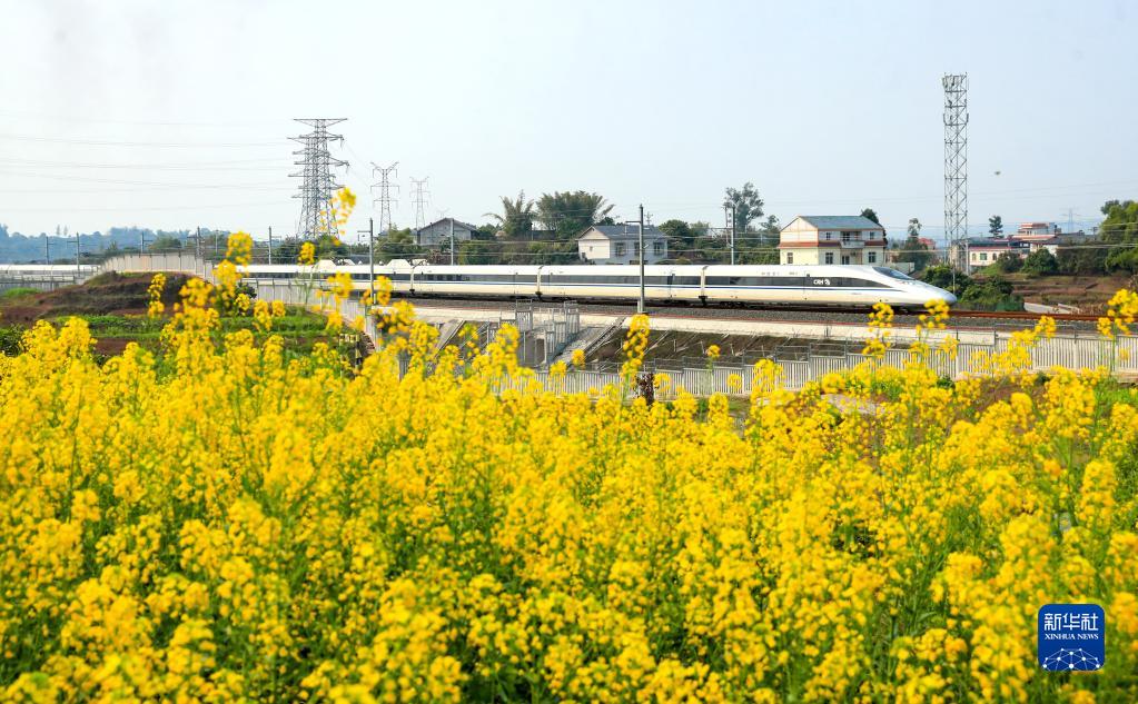 春暖花開時節,油菜花陸續盛開,列車穿行其間,美不勝收。