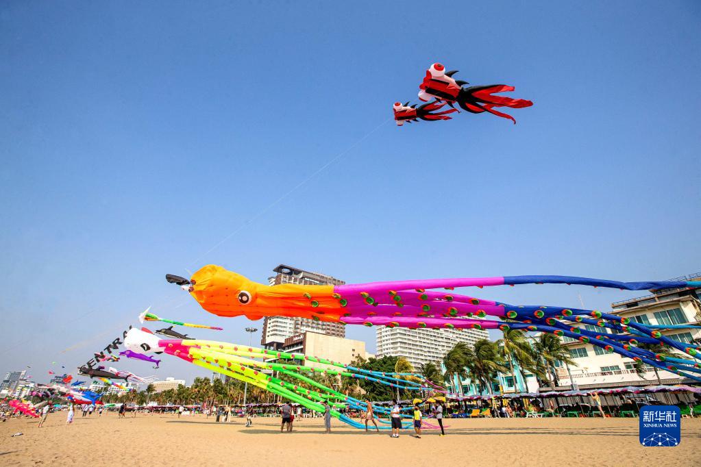 這是2月27日在泰國芭提雅海灘拍攝的大型風箏。泰國芭提雅近日舉辦海灘風箏節。