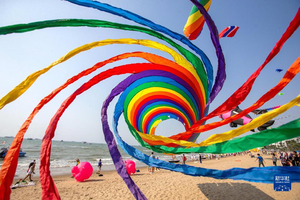 這是2月27日在泰國芭提雅海灘拍攝的大型風箏。泰國芭提雅近日舉辦海灘風箏節。
