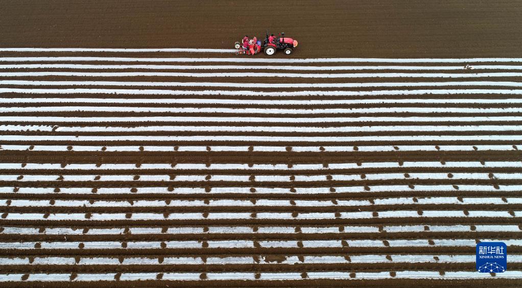 2月28日,在河北省石家莊新樂市東王鎮孔村馬鈴薯種植基地,農戶駕駛農機進行馬鈴薯播種作業(無人機照片)。