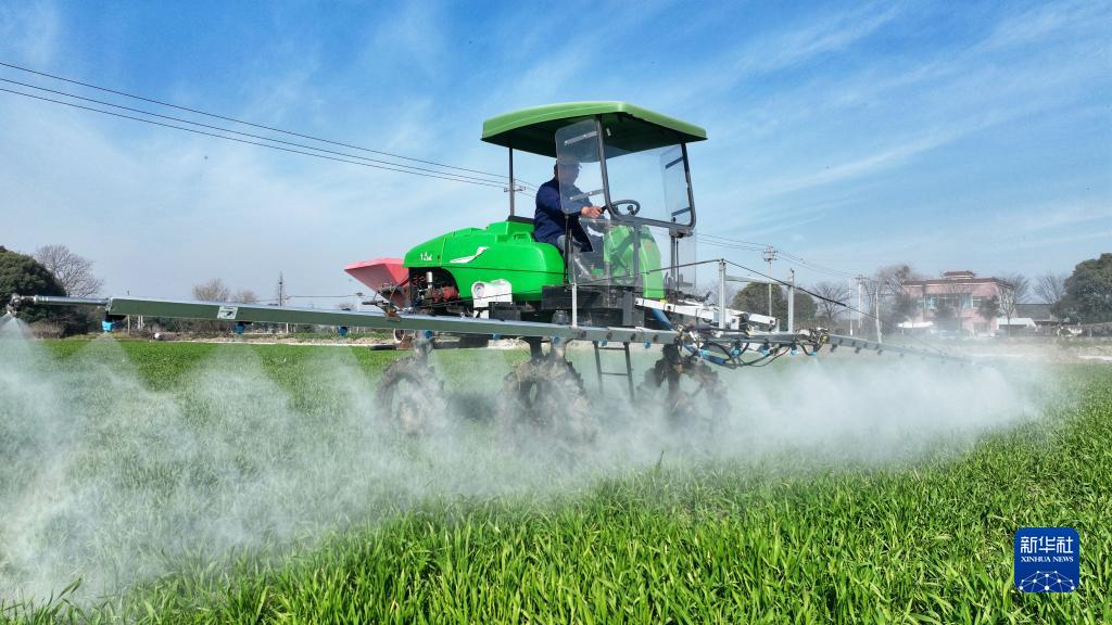 2月28日,在浙江省湖州市德清縣禹越鎮天皇殿村,農民駕駛自走式高桿噴霧機對小麥進行噴藥作業(無人機照片)。