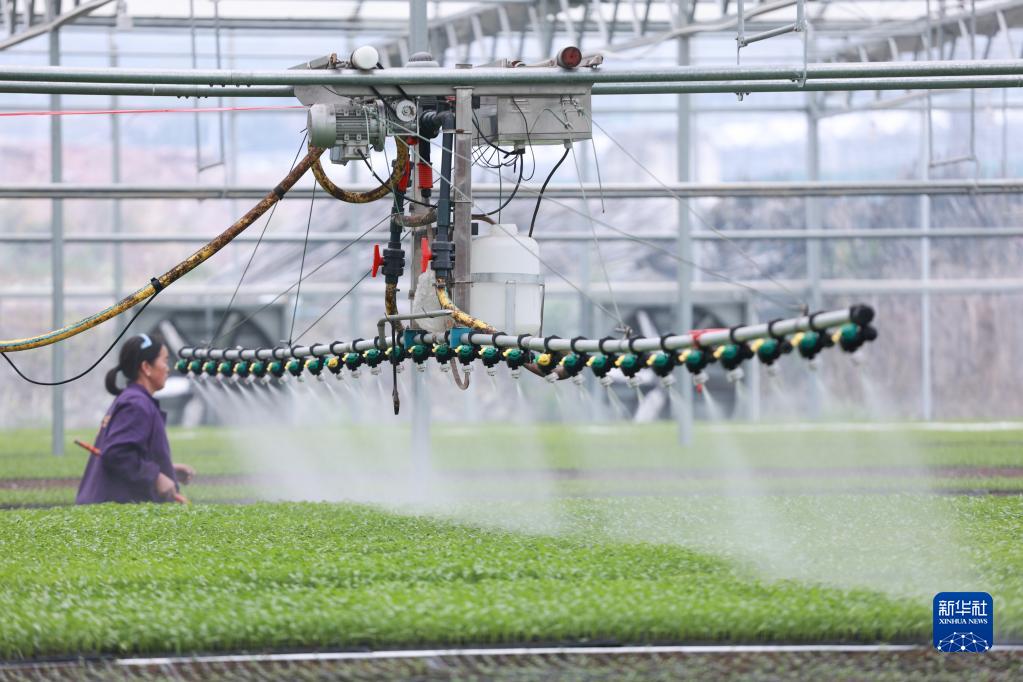 在貴州省榕江縣車江壩區智慧育苗中心內,當地農民運用水稻缽體育秧機、水肥一體自動噴淋機、多功能育苗大棚等機械化、智能化設備進行育秧育苗生產,有效提高了勞動效率和種苗質量,助力春耕生產。