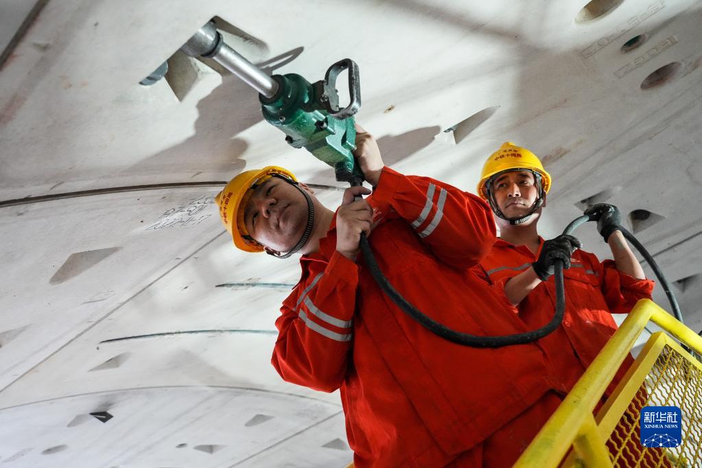 2月28日,施工人員在廣湛鐵路湛江灣海底隧道盾構區間鉚固隧道管片。