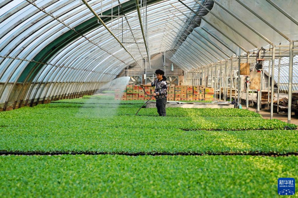 2月28日,河北省巨鹿縣觀寨鎮南哈口村村民在育苗棚內給蔬菜秧苗澆水。