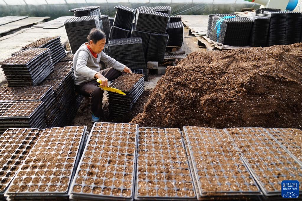 2月28日,在河北省巨鹿縣觀寨鎮一座育苗棚內,農民在給育苗盤裝培養土。