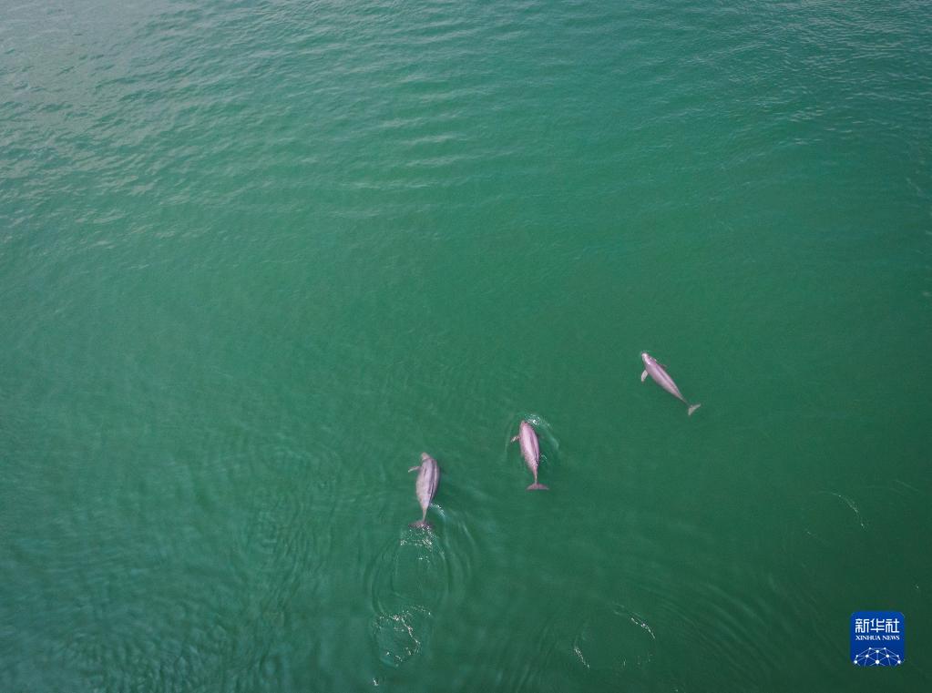 在湖北省宜昌市,長江江豚在水中嬉戲(2021年5月11日攝,無人機照片)。