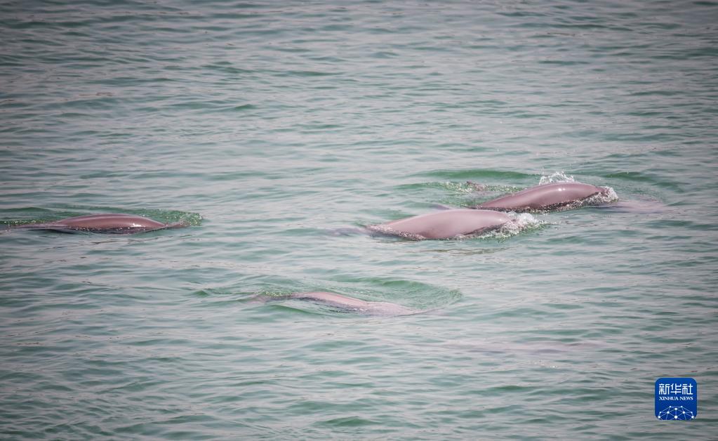 在湖北省宜昌市,長江江豚在水中嬉戲(2021年5月11日攝)。