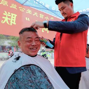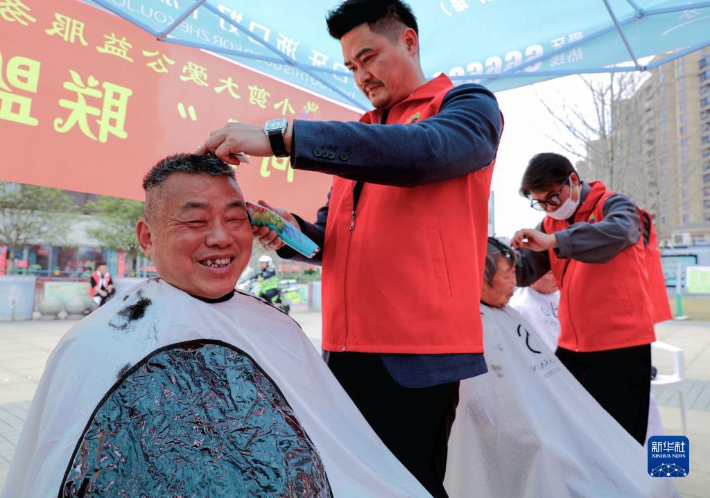 2月28日,在長興縣和文化廣場上,雉城街道社工志愿者給市民免費理發。
