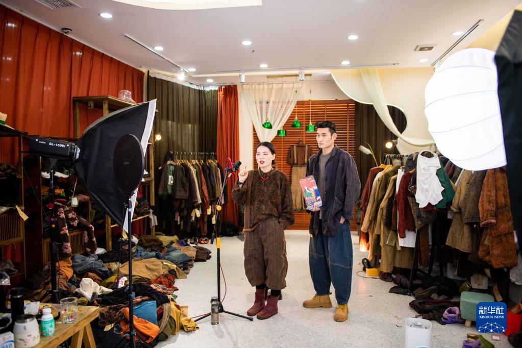 2月28日,主播在湖南省株洲市蘆淞區華麗服裝批發大市場直播銷售服裝。
