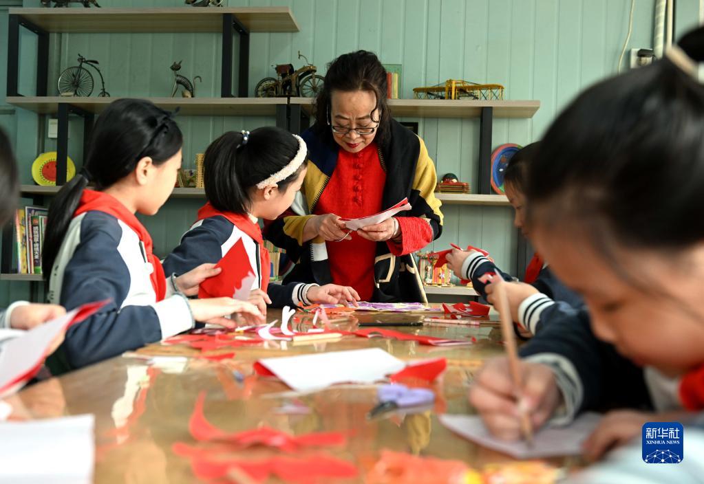 2月28日,國家級非遺蔚縣剪紙代表性傳承人周淑英(左三)在石家莊市東風小學非遺工坊給學生傳授剪紙技藝。