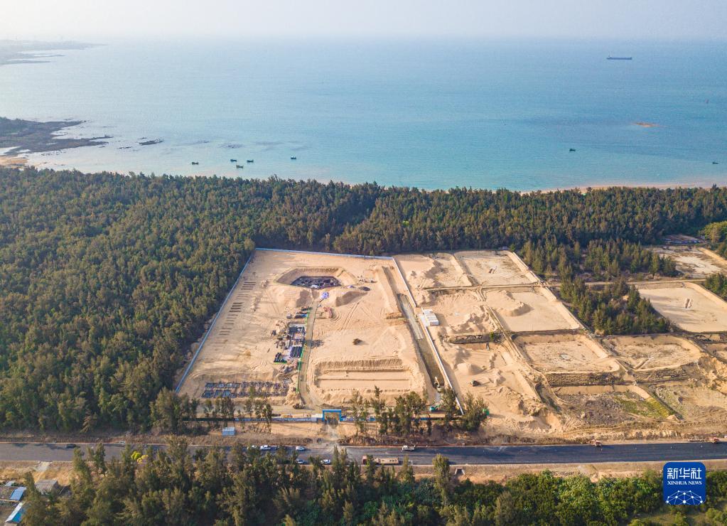 2月27日在海南省儋州市拍攝的建設中的“夕照儋耳”驛站和環島旅游公路(無人機照片)。