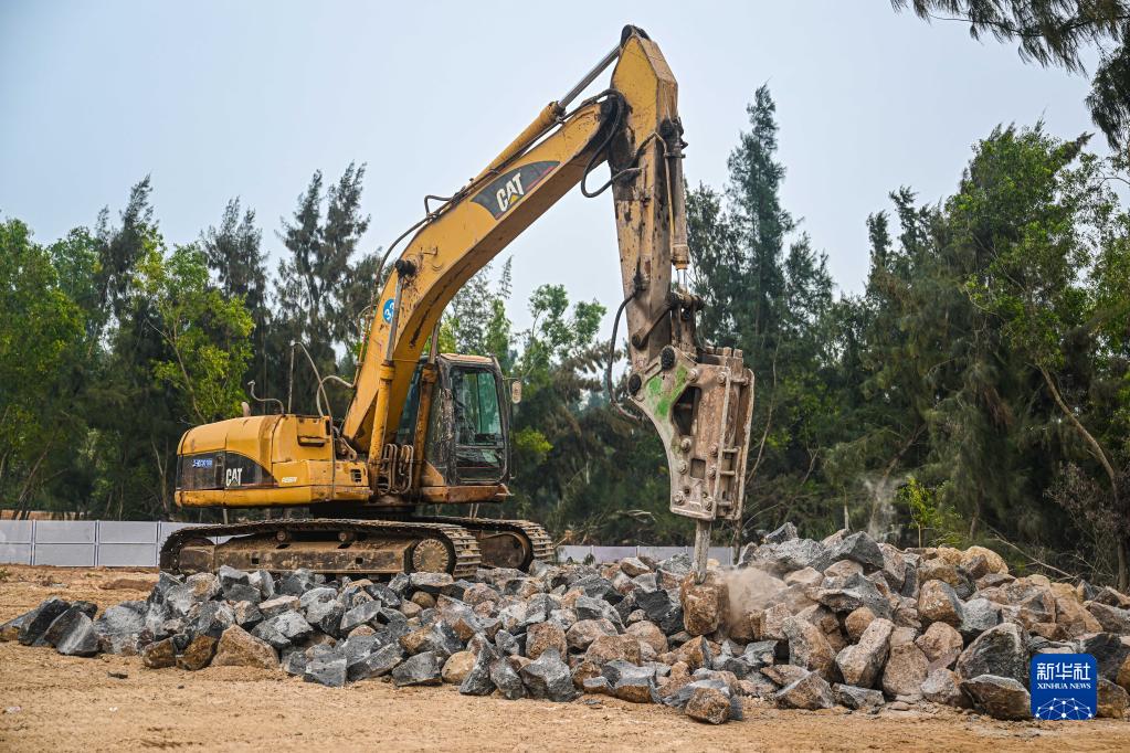 工人在位于海南省儋州市的“火山海岸”驛站工地施工(2月24日攝)。