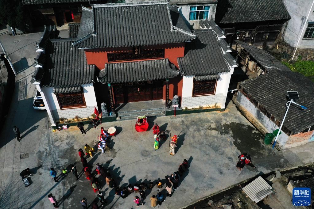 侗戲班在貴州省天柱縣鳳城街道潤松村表演侗戲(2月26日攝,無人機照片)。