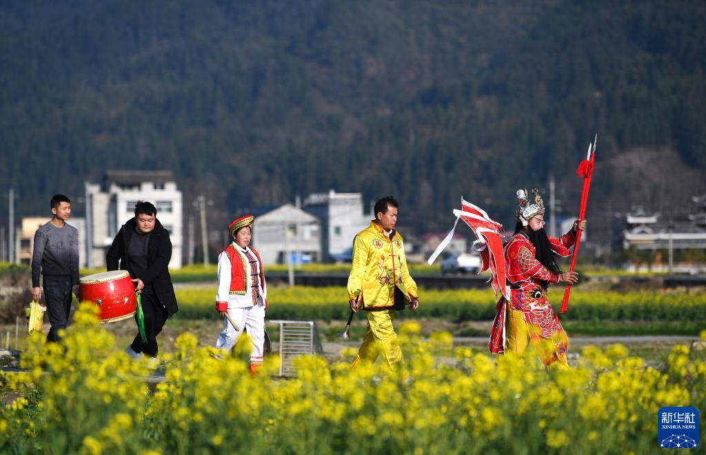 在貴州省天柱縣鳳城街道,侗戲班在下鄉送戲演出途中(2月26日攝)。