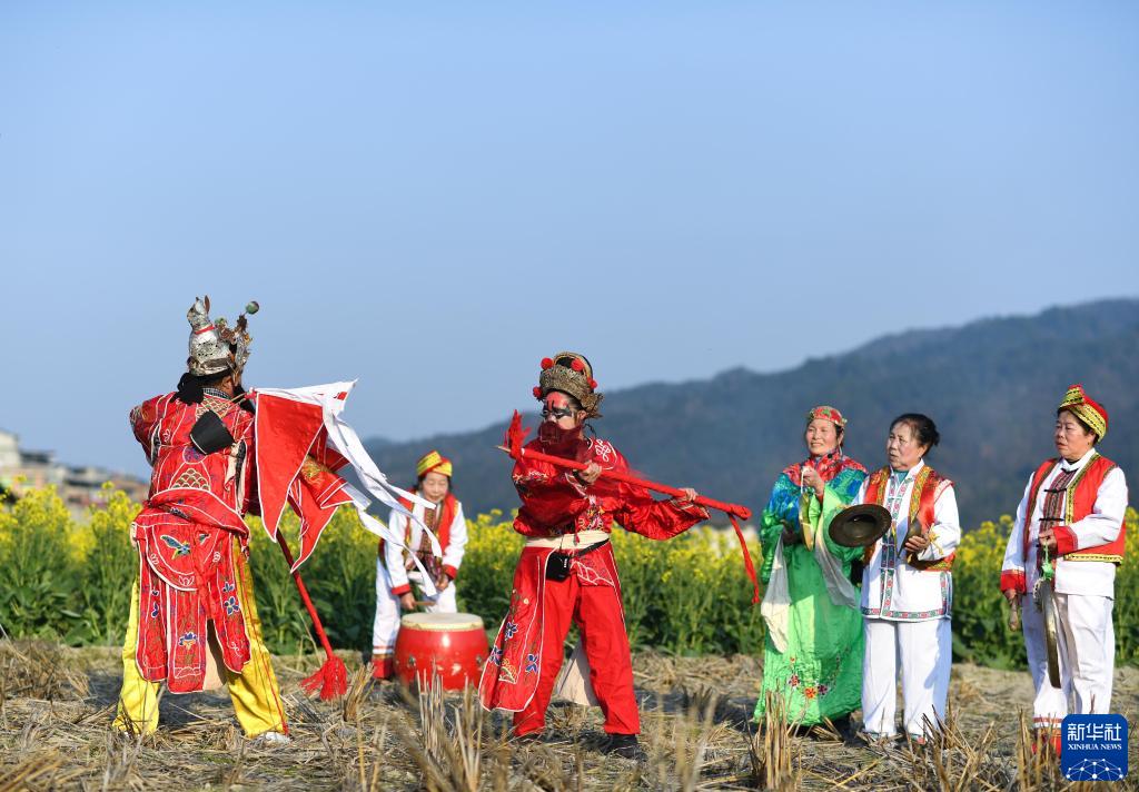 侗戲班在貴州省天柱縣鳳城街道潤松村的田野里排練侗戲(2月26日攝)。
